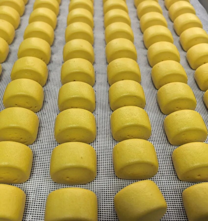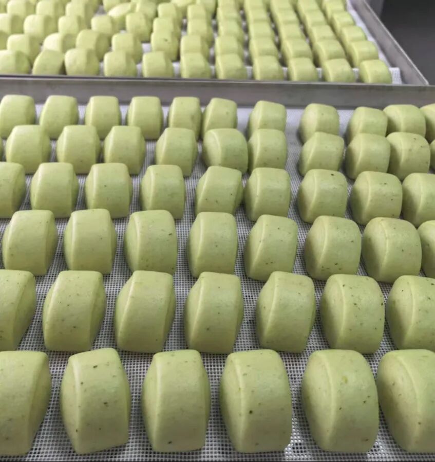 试产现场,一颗颗钻石南瓜,经自动化设备完成削皮、清洗、切片、蒸煮,制成细腻南瓜蓉后,与优质面粉一同投入智能搅拌机充分混合。在数控系统精准控制下,金黄色面团经恒温恒压反复碾压成质地均匀的面皮,再由高速成型机瞬间切割为大小统一、造型规整的方形面坯。经过十分钟智能精准醒发,面坯送入现代化蒸汽房,片刻即蒸出一屉屉热气腾腾、色泽诱人的“黄金小馒头”。