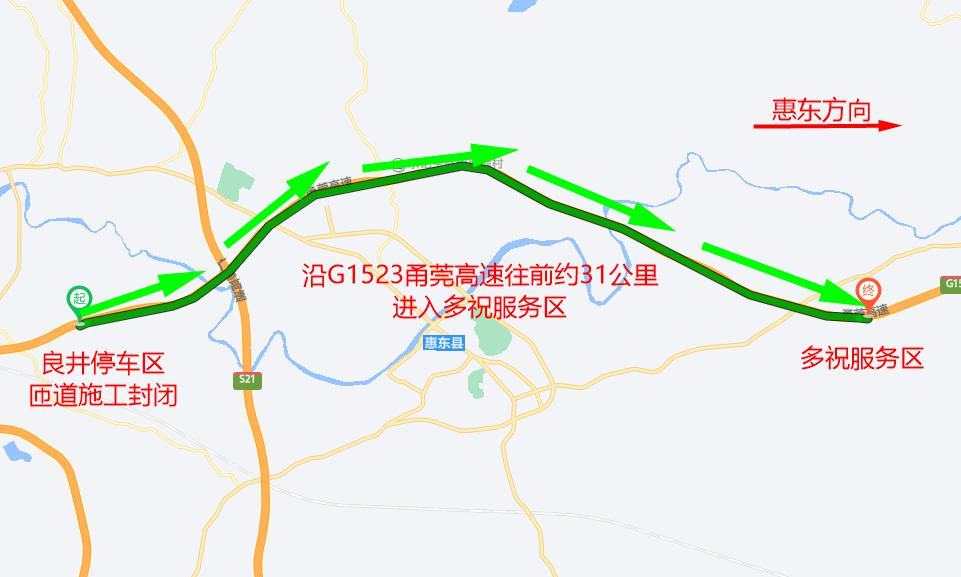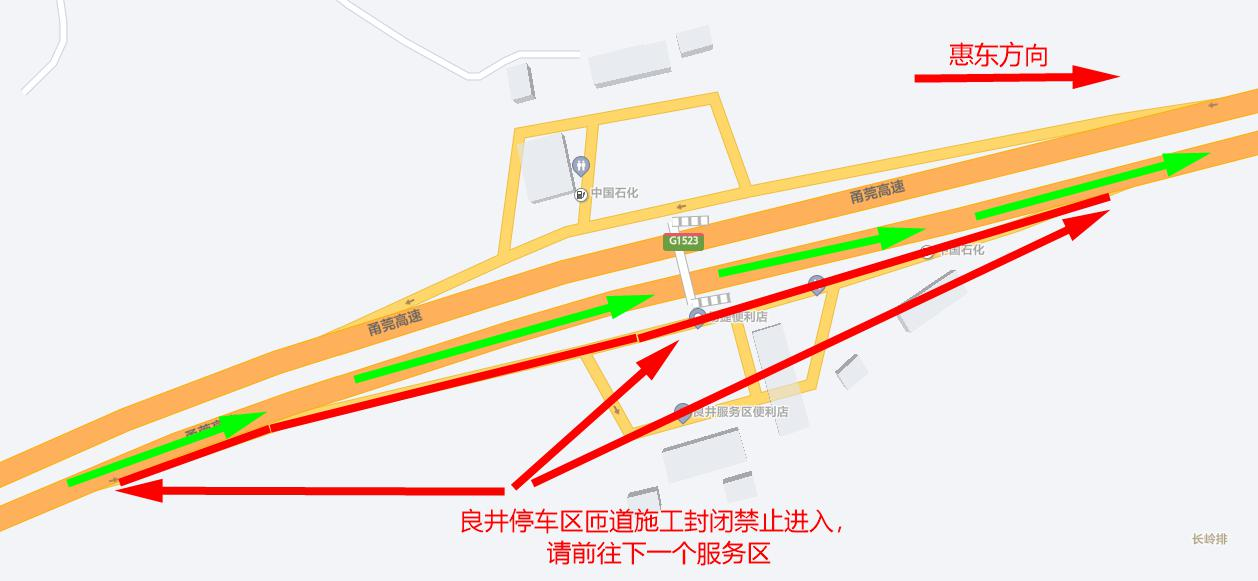 1月15日6:00至22:00,G1523甬莞高速往惠州惠东方向良井停车区匝道实施交通管制,禁止车辆通行(见图7)。往惠州惠东方向的车辆可沿甬莞高速行驶进入多祝服务区(见图8)。