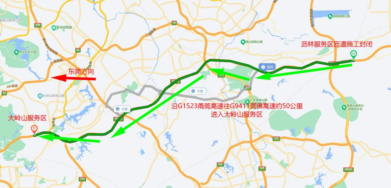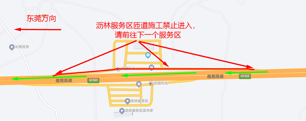 其中,1月12日6:00至22:00,G1523甬莞高速往东莞方向沥林服务区匝道实施交通管制,禁止车辆通行(见图1)。往东莞方向的车辆可行驶至莞佛高速进入大岭山服务区(见图2)。